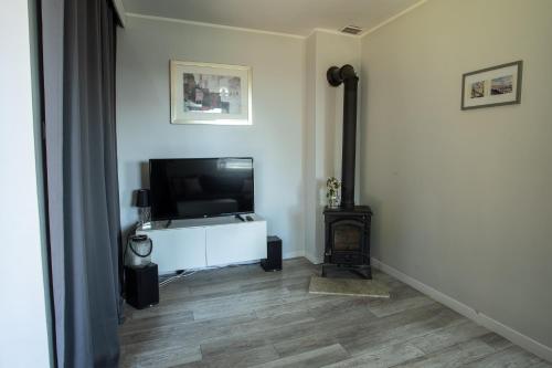 The holiday home with a terrace and lake views features 2 bedrooms, a living room, a flat-screen TV, an equipped kitchen with kitchenware, and 2 bathrooms with an a bath or shower. There is also a seating area and a fireplace.