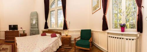 This room is located in the villa's turret. It enjoys good views of the mountains surrounding Sinaia. The unit has 2 semi-circle stained-glass windows, a new bathroom, and a king-size bed.